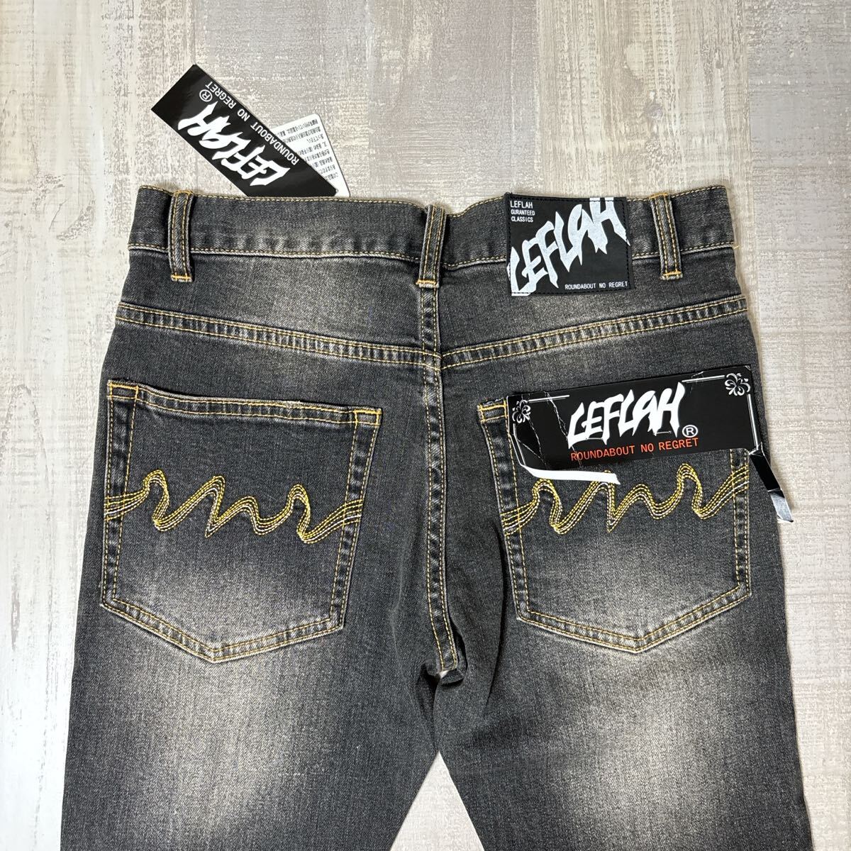 > 【新品タグ フラッシャー付 バック刺繍】LEFLAH ダメージ加工 デニム スキニー ストレッチ パンツ レフラー サイズM ユーズド ヴィンテージ