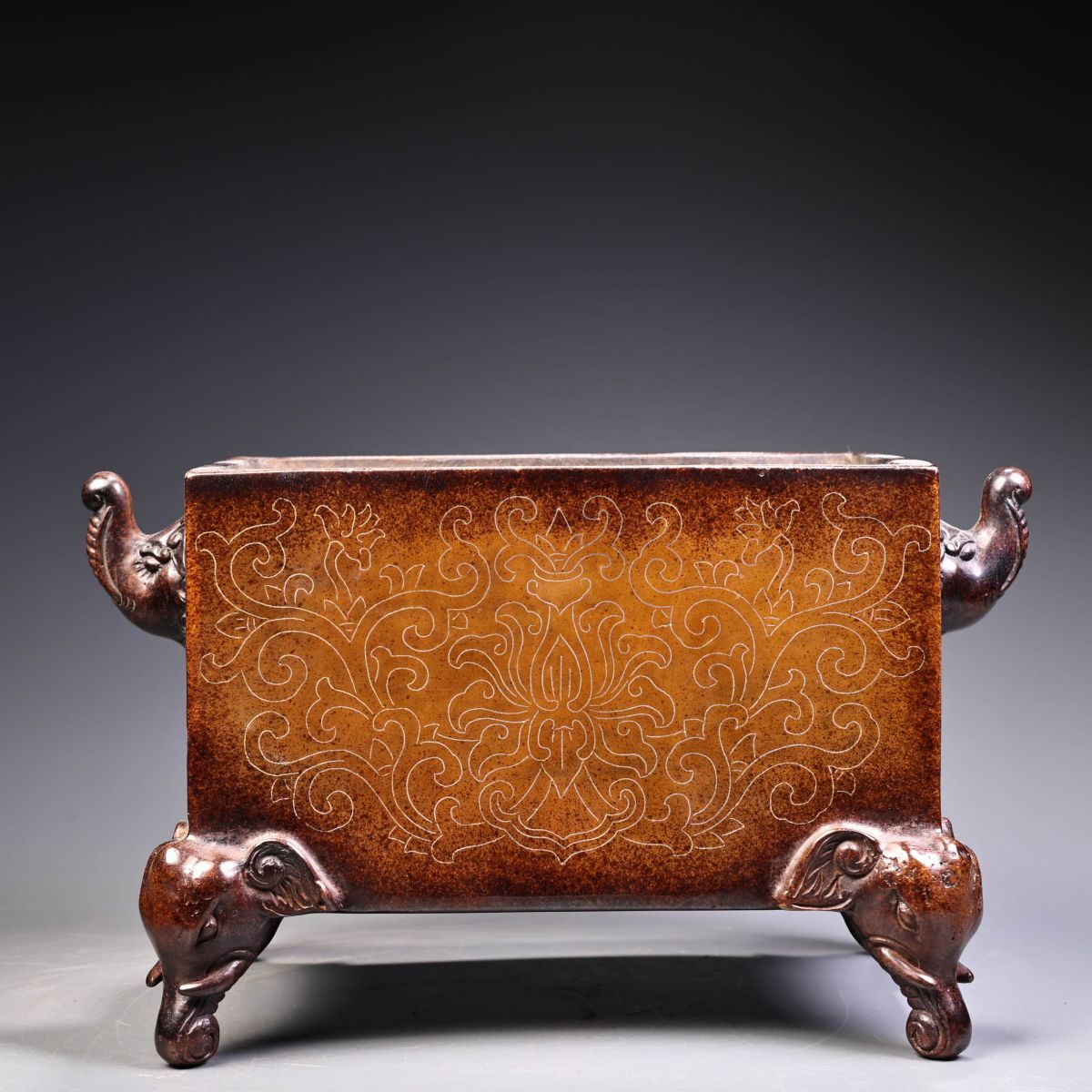- 永し 明時代 石叟銘 古銅錯銀絲 象足 象耳馬槽爐 香爐 極細工 古銅彫 置物擺件 古美術品 時代物 古董品 収集 古美味 旧家蔵出 中国唐物 A5