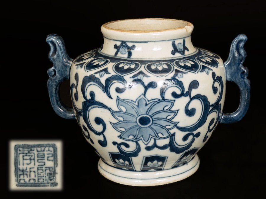 ●乾隆年製 款 中国 青花花唐草文 双耳壺 壺 中国美術●拍卖
