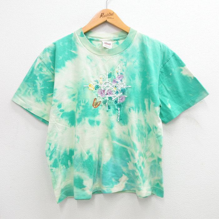 > 古着 半袖 ビンテージ Tシャツ レディース 00s アサガオ チョウ 刺繍 コットン クルーネック 緑他 グリーン タイダイ 24jul3