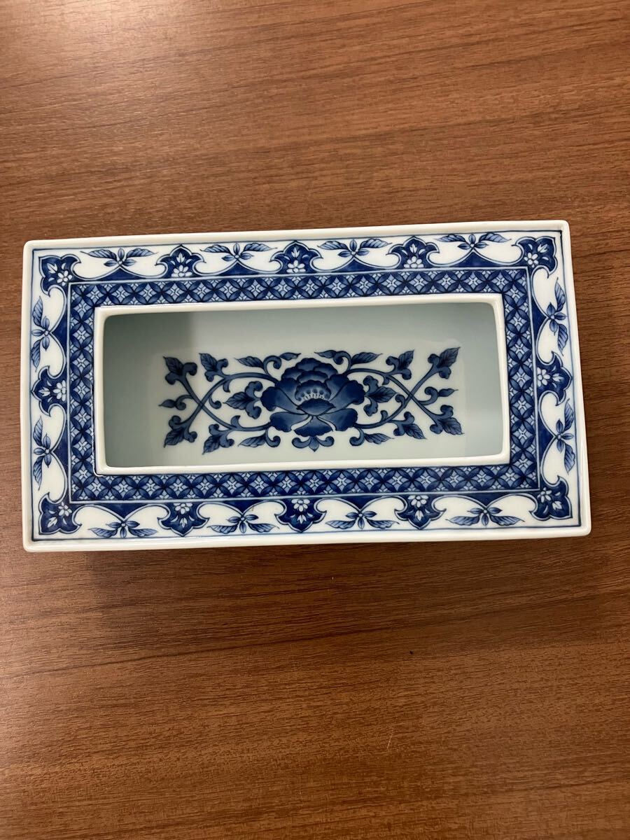 - 美濃焼 庫山窯 陶器 箱型灰皿 小物入れ 染付 昭和レトロ 焼物