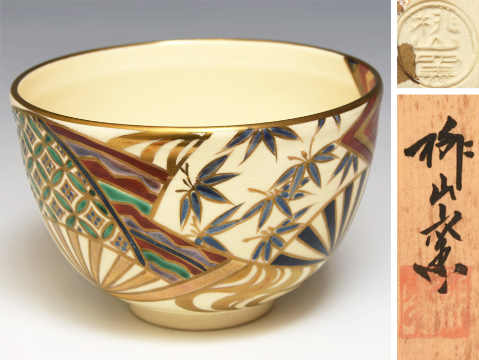 > 桃山窯 (造) 色絵扇面文 茶碗 共箱 共布 茶道具 陶磁器 茶碗 u1016a