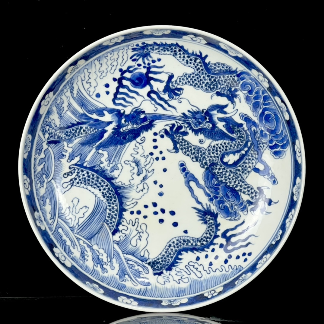 > 早期收藏 古陶磁器 青花 海水龍紋盤 賞盤 文案置物 磁器 陶芸 擺件 時代物 古董品 骨董 旧家蔵出し 唐物 中国古玩 古美術品