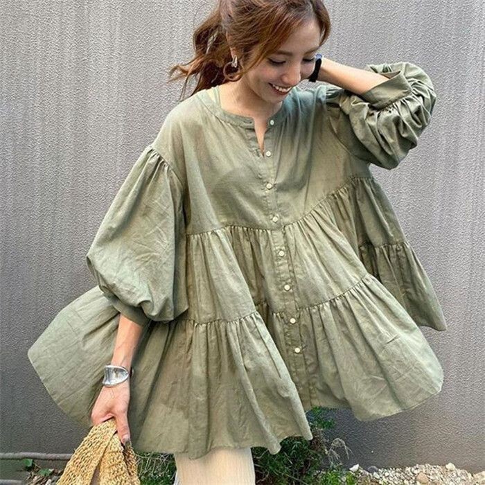 - フレアブラウス ボリューム袖ブラウス レディース 春夏 チュニック ティアードブラウス 七分袖 パフスリーブ スタンドカラーブラ