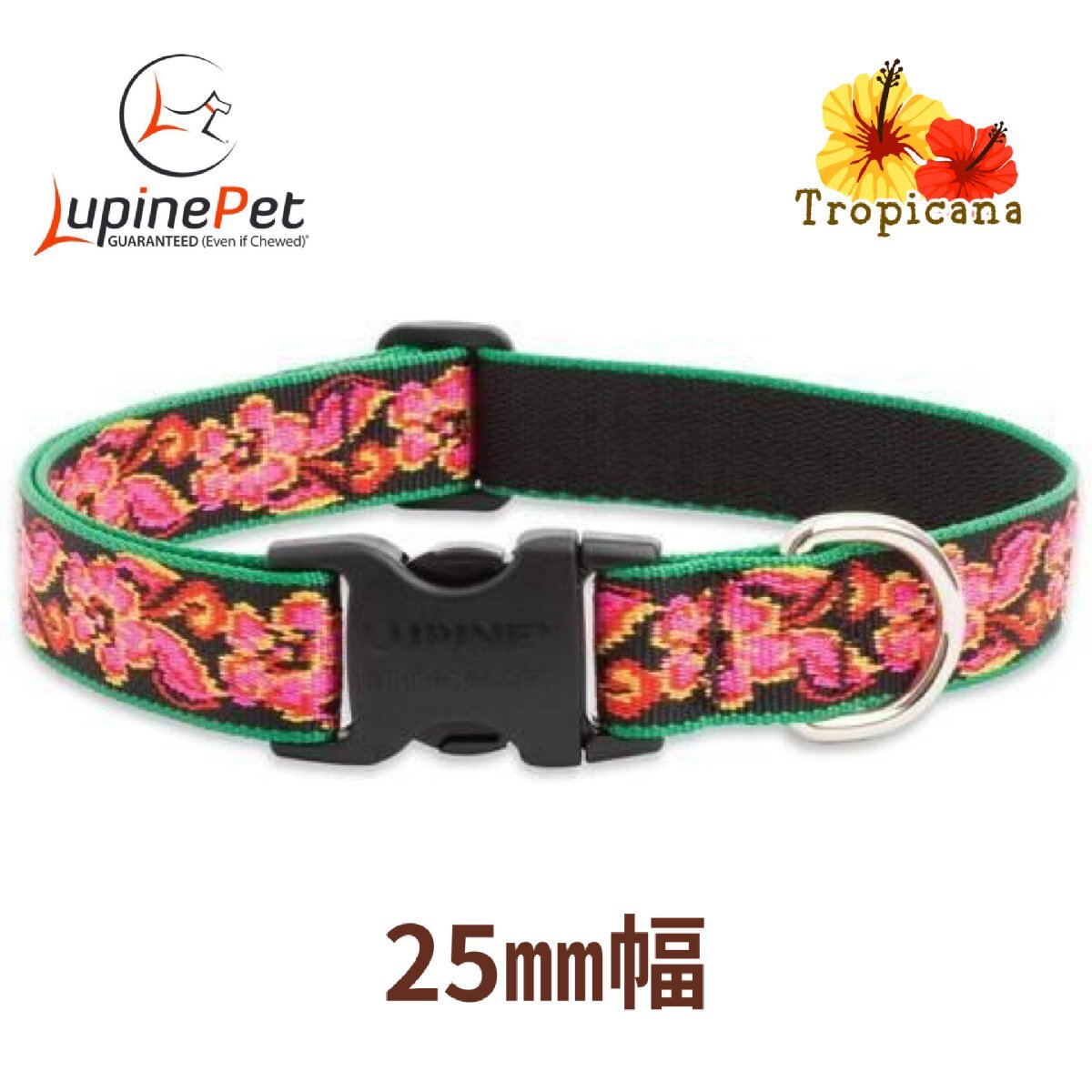 > ワンタッチ首輪・Mサイズ・25mm幅 トロピカーナ柄Tropicana 40-71cm LUPINEルパイン アメリカ製 軽量 丈夫 中型犬・大型犬