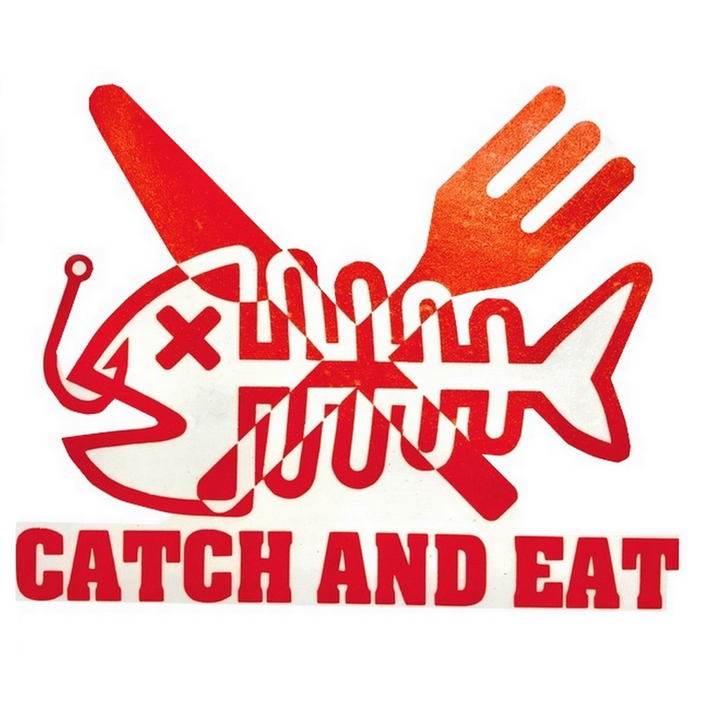 > 釣り ステッカー CATCH AND EAT 【赤】 Sサイズ 横幅15㎝ キャッチ&イート 釣り具 フィッシング 切抜き ステッカー シール 防水 屋外OK