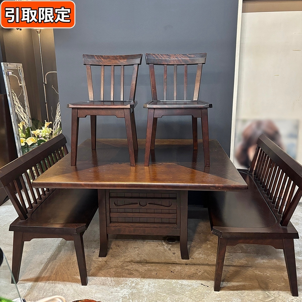> 【福岡T】☆引取限定☆北海道民芸家具 囲炉裏5点セット 囲炉裏テーブル 長椅子2脚 チェア2脚 火鉢 伝統工芸 和家具【CA0823-6】