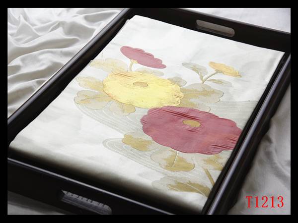 - 蔵【T1213】厳選逸品 菊紋 シルバー色地 気品豊かに 正絹高級美術名古屋帯 未使用 ◇検簪着物袋帯和装小物帯締め