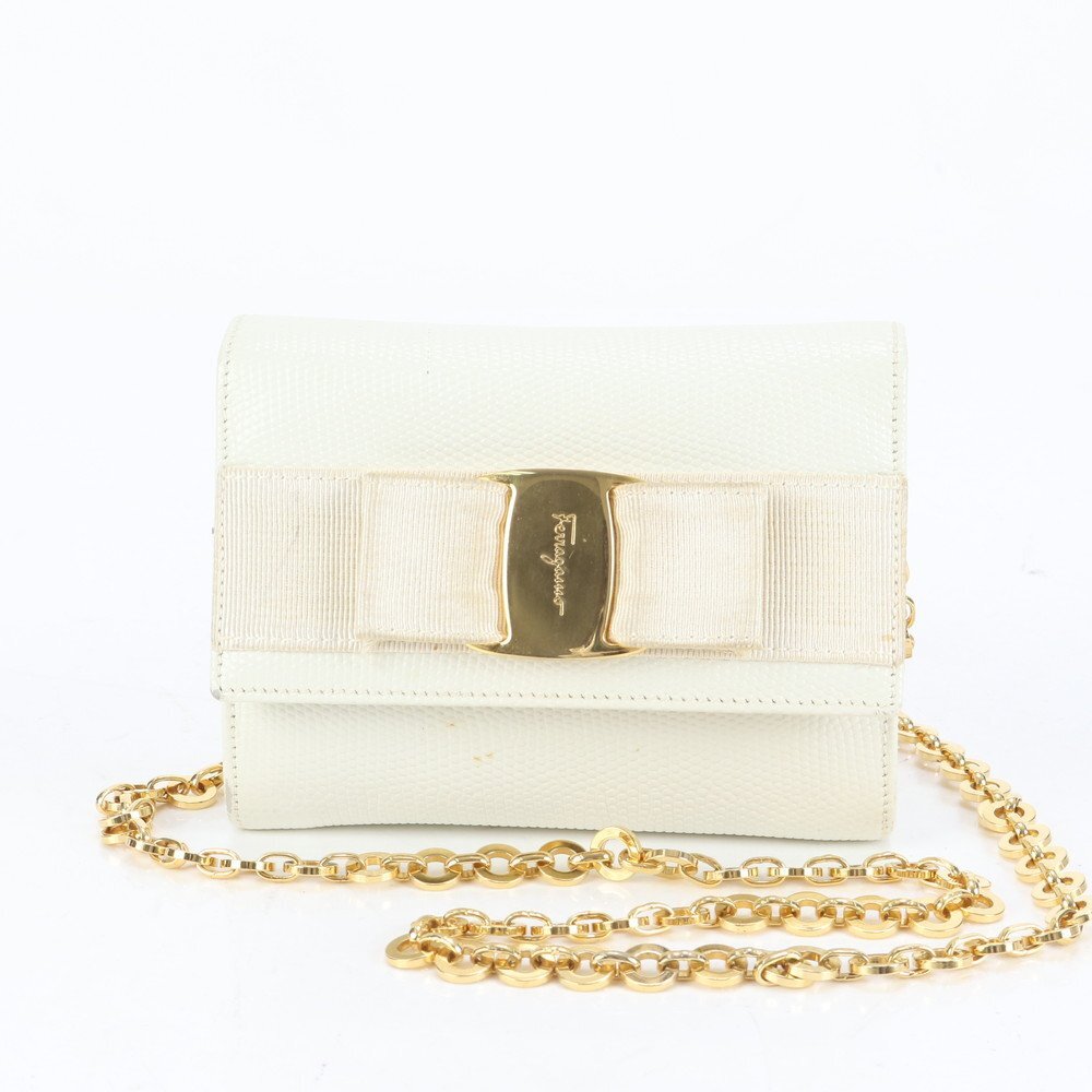 > 1円■サルヴァトーレフェラガモ■ヴァラ リボン リザード エンボス レザー チェーン ショルダーバッグ 斜め掛け レディース EEE CQ8-5