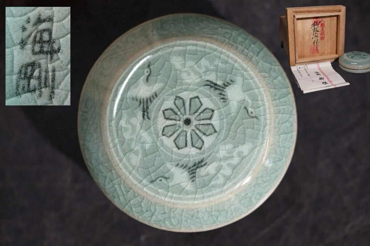 > 柳海剛 ( 柳根瀅 )作 高麗青磁 雲鶴文 白黒象嵌 香合 栞・共箱付 / 名工 人間文化財 香道具 .G2612