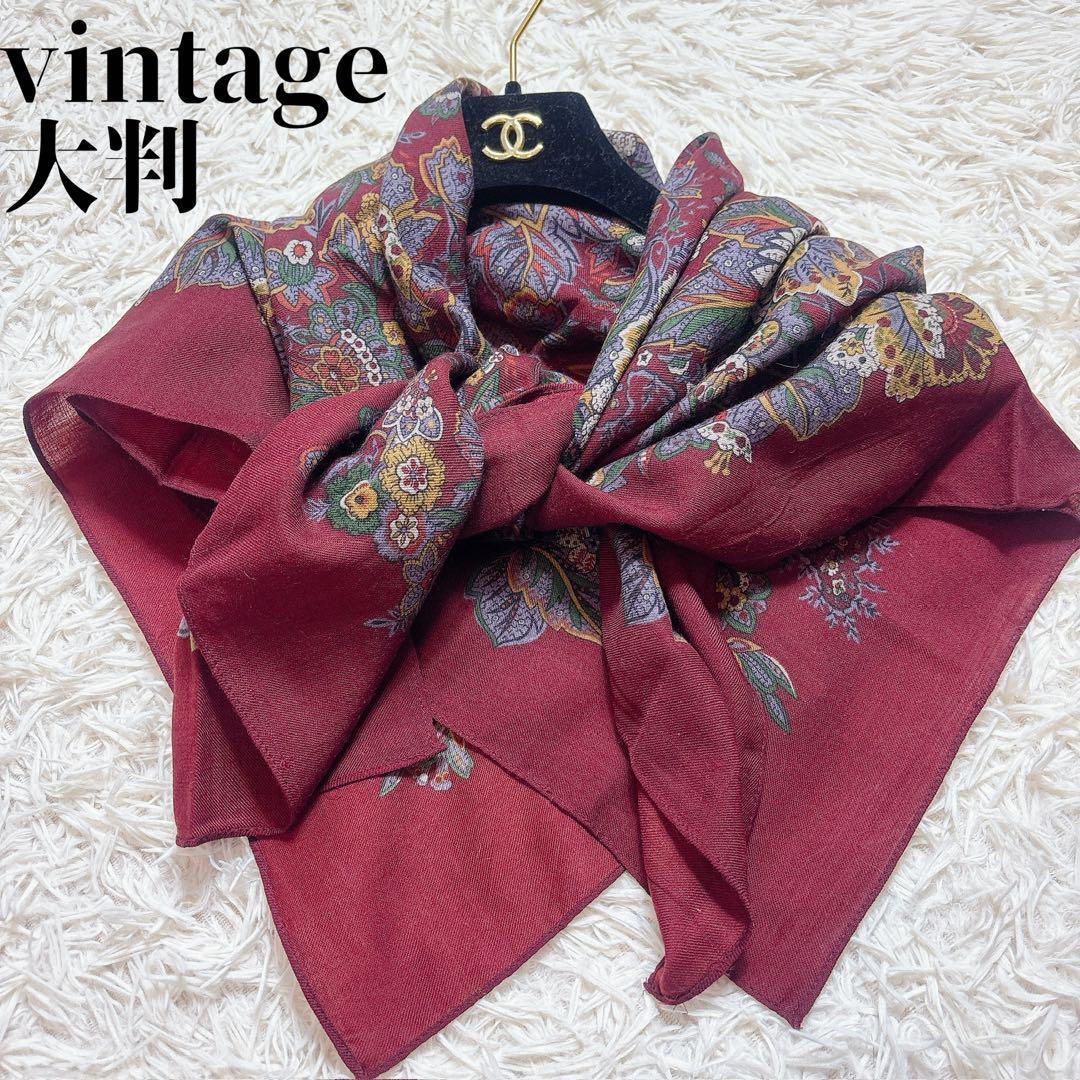 > 美品 スカーフ バンダナ ショール 毛 ウール 大判 花柄 ボタニカル フローラル レッド マルチカラー上品 高級感 総柄 ムーンバット