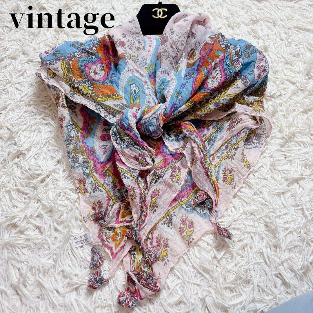 - ストール ショールフリンジ 大判 アジア ピンク オフィスカジュアル 上品 高級感 総柄 マルチカラー ヴィンテージ