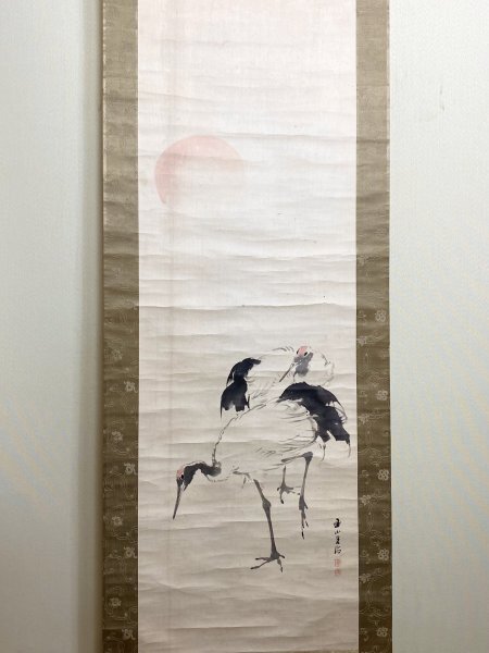 > 《魚亀》【模写】岸連山「旭日双鶴図」紙本 識箱 岸駒師事 茶掛 茶道具 古美術 掛軸 中国 掛け軸 人が書いたもの