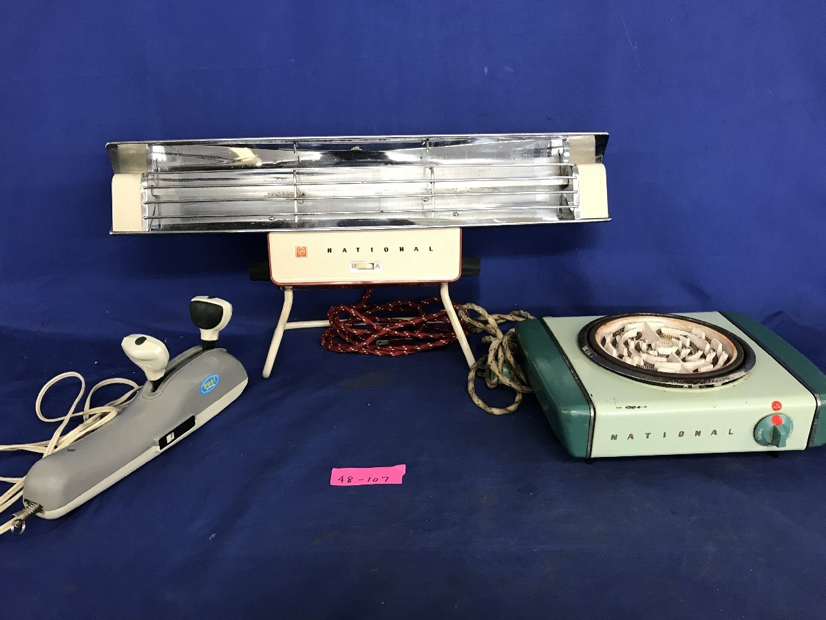 > ★48―107★レトロ家電3点まとめ ナショナル 電気コンロ B型 NK-69/電気ストーブ NS-D6/マッサージ機 EV-26 動作品 当時物[140]