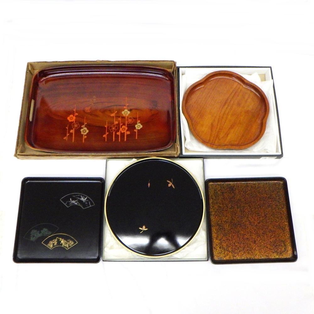 - 25-H-167 お盆5点まとめセット 山中漆器 山中塗 寿彌/紫雲 取っ手つき長方盆/梅型 盆 角盆 丸盆トレー 26cm~48.5cm 漆 美品あり