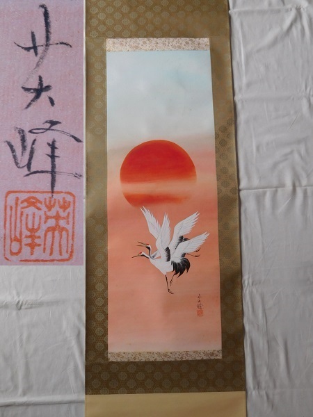 - 【模写】掛け軸 旭日双鶴図 〇峰銘 作者不明 在銘 落款 紙本肉筆 人が描いたもの