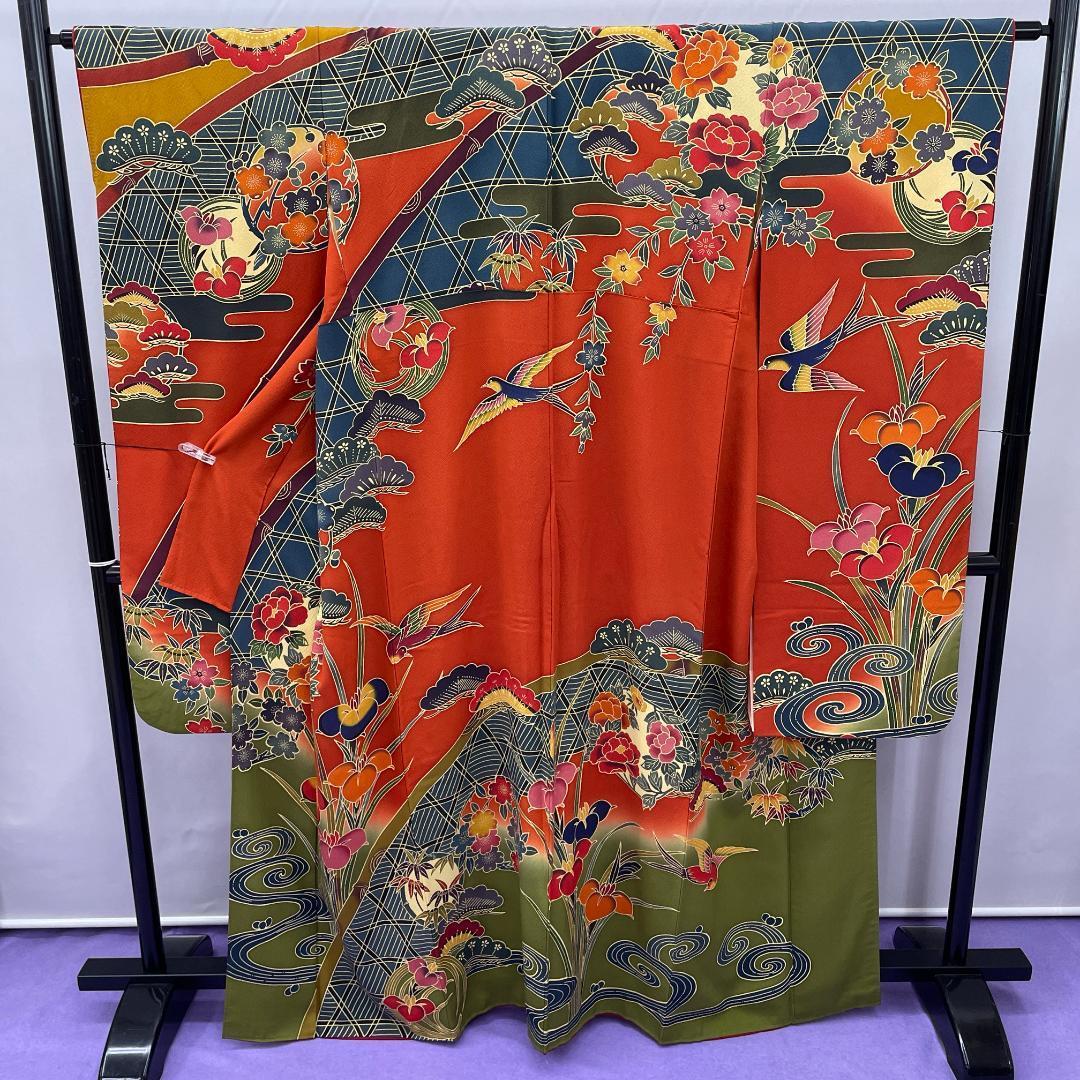 - ★3262★ 振袖 赤茶色 暗い緑色 鳥 花柄 襦袢付き 着物セット
