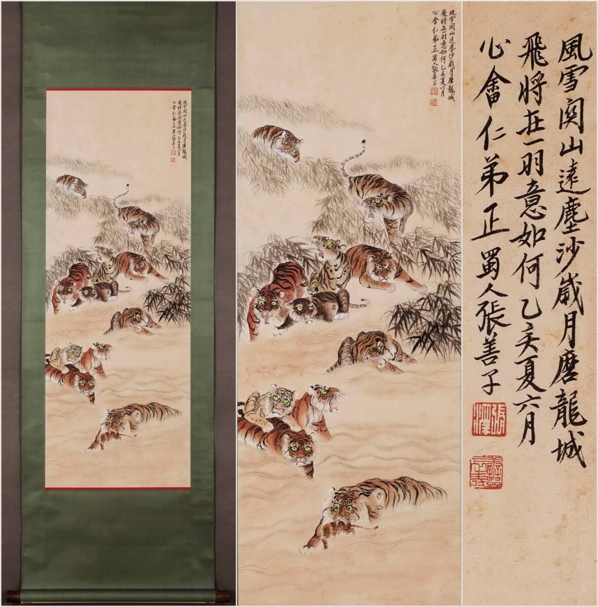 - 古美術 掛け軸 中国・近現代 「張善子書」 紙本 【竹渓虎群図】 立軸 書道 巻き物 肉筆保証 唐物 古画 画心126x46cm LT-2509112