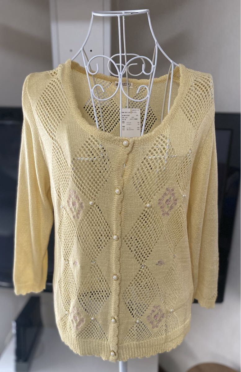 - 新品未使用品axes femme透かし編みカーディガン イエロー パールボタン 花柄刺繍 カーディガン