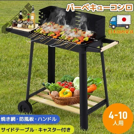 - 【国内発送】バーベキューコンロ BBQコンロ 焼き網 防風板 ハンドル ローストラック付き 棚板 タイヤ追加 移動楽々 バーベキュー 屋外用