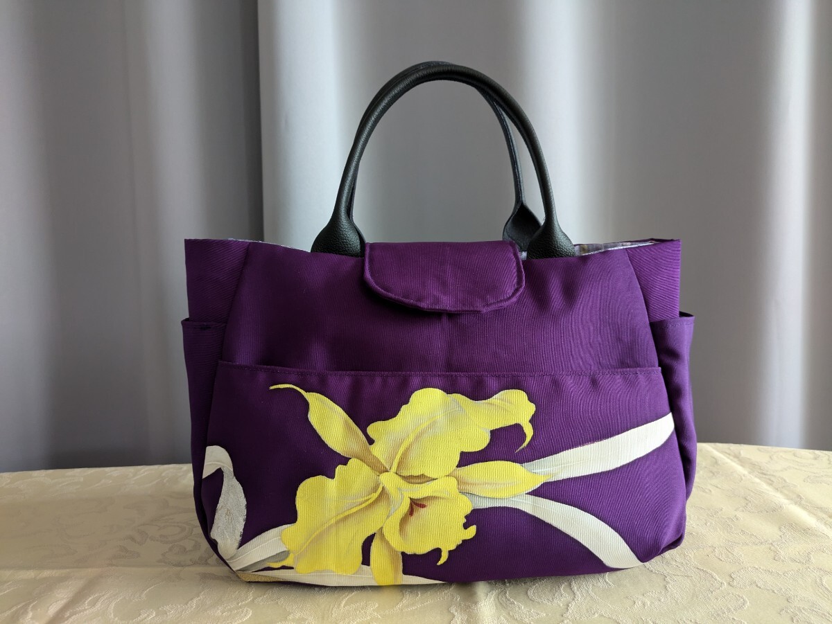 - 送料無料☆名古屋のリメイクバッグ チューリップバッグ 紫 本革持ち手 フラップ付き ポケット