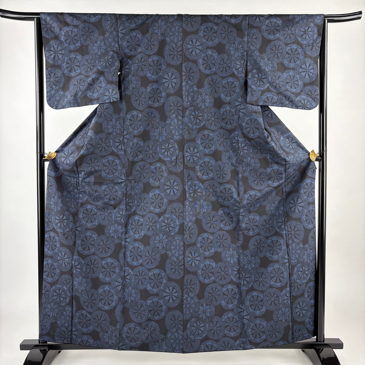 > 紬 身丈161cm 裄丈64cm M 袷 ガロンテープ 源氏車 墨色 正絹 秀品 【中古】