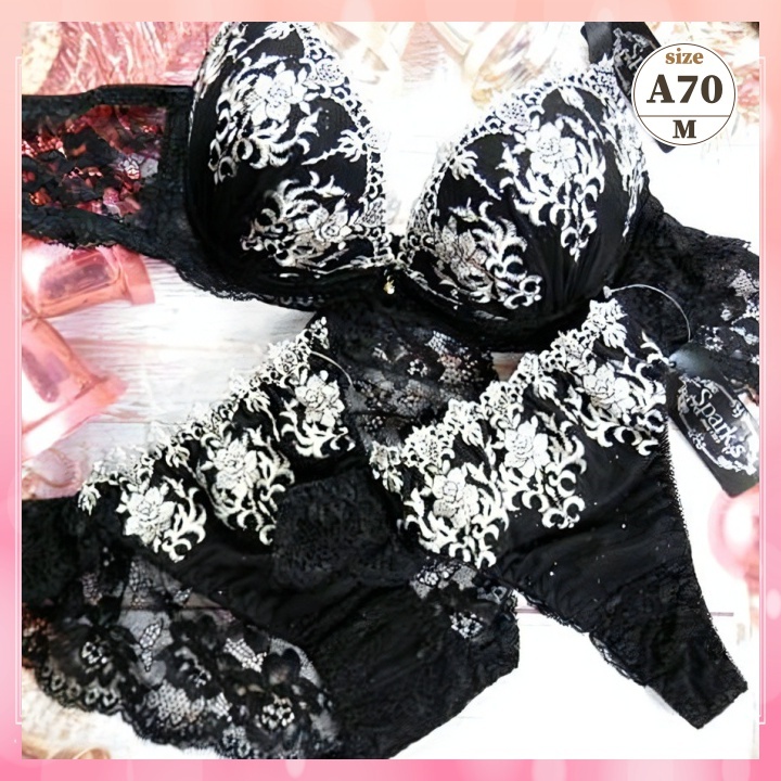 > Za7001◆新品 ブラショーツセット【A70/M】下着 レースバック&Tバックセット セクシー 脇高 美谷間 ローズ刺繍 黒