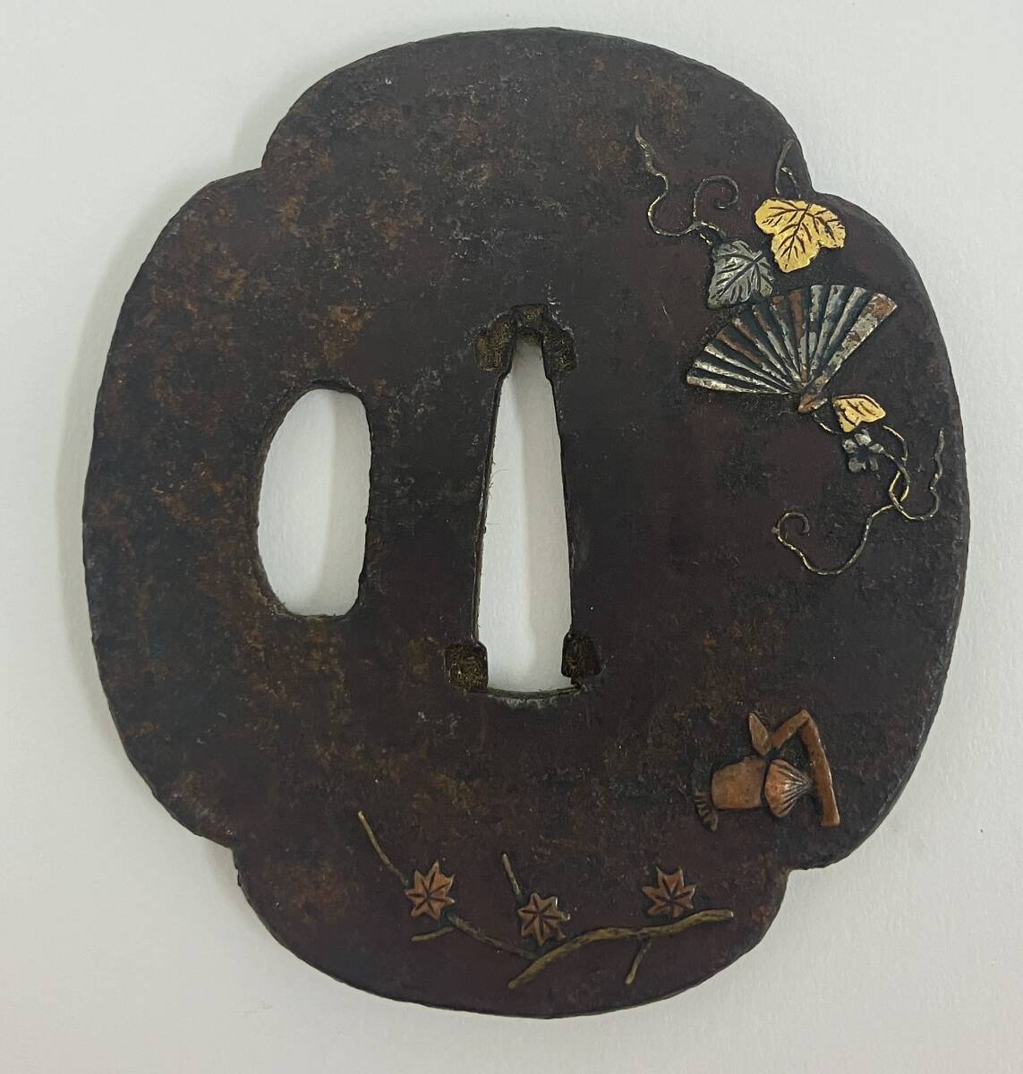 - H09221 1円出品 骨董品 骨董 刀道具 鍔 つば 無銘 扇子 木 図 日本刀装具 重量 約89g コレクション