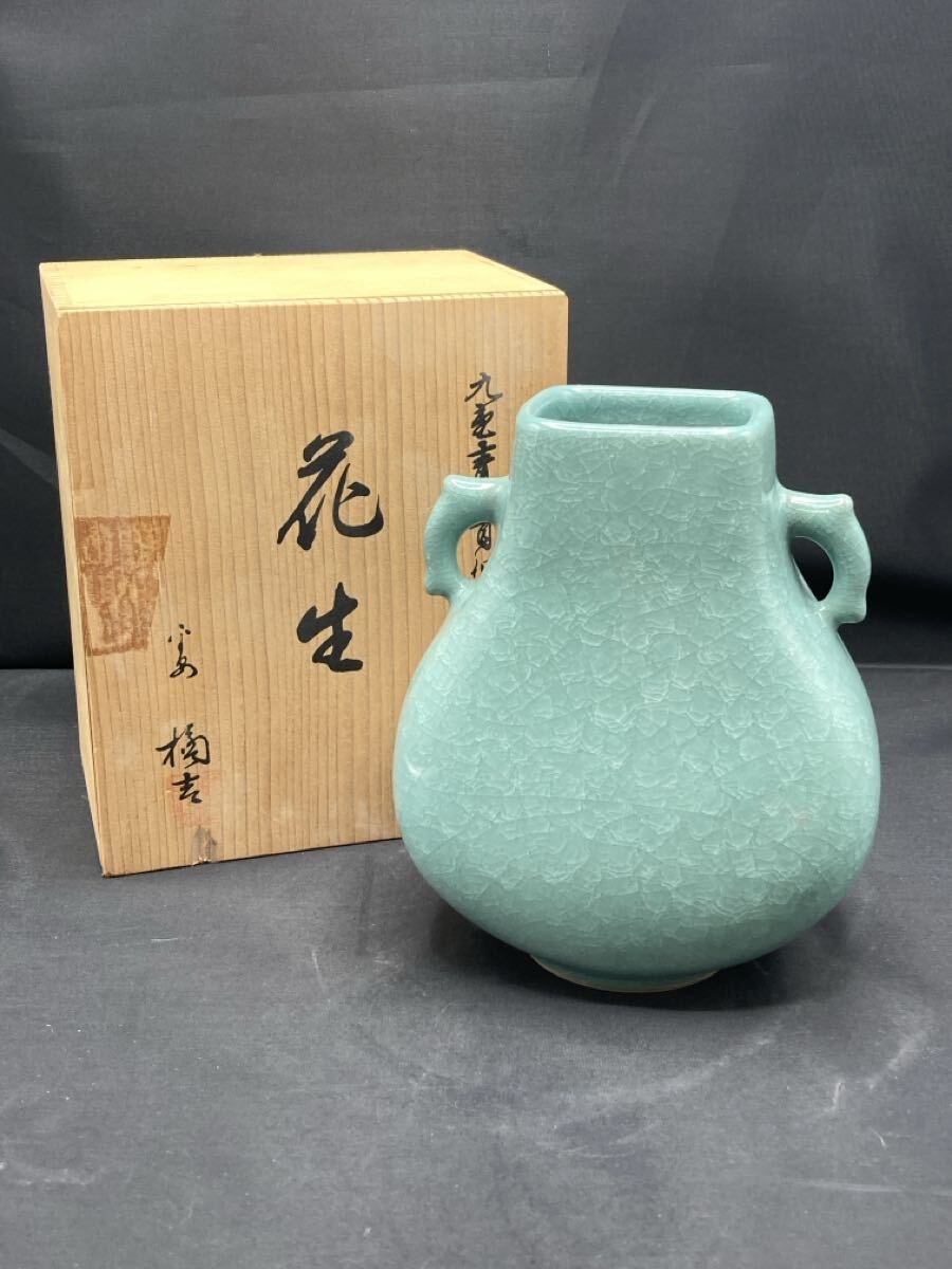 - m0916701-3 橘吉 九重青磁耳付 民芸陶器 華道 生け花 和風置物 オブジェ 壺 インテリア装飾 花器 花具 花壺 花生花瓶 ビンテージ 中古品