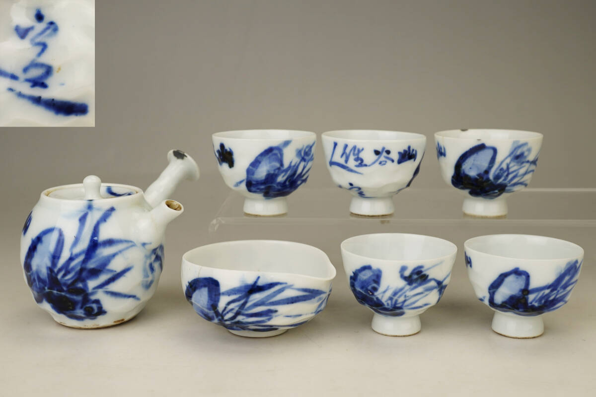 - 鳴】清水六兵衛 染付 茶器揃い miniサイズ 小振り 桐箱付き 259-94検:鉄瓶 銀瓶 煎茶 急須 茶道具 常滑焼 九谷 薩摩
