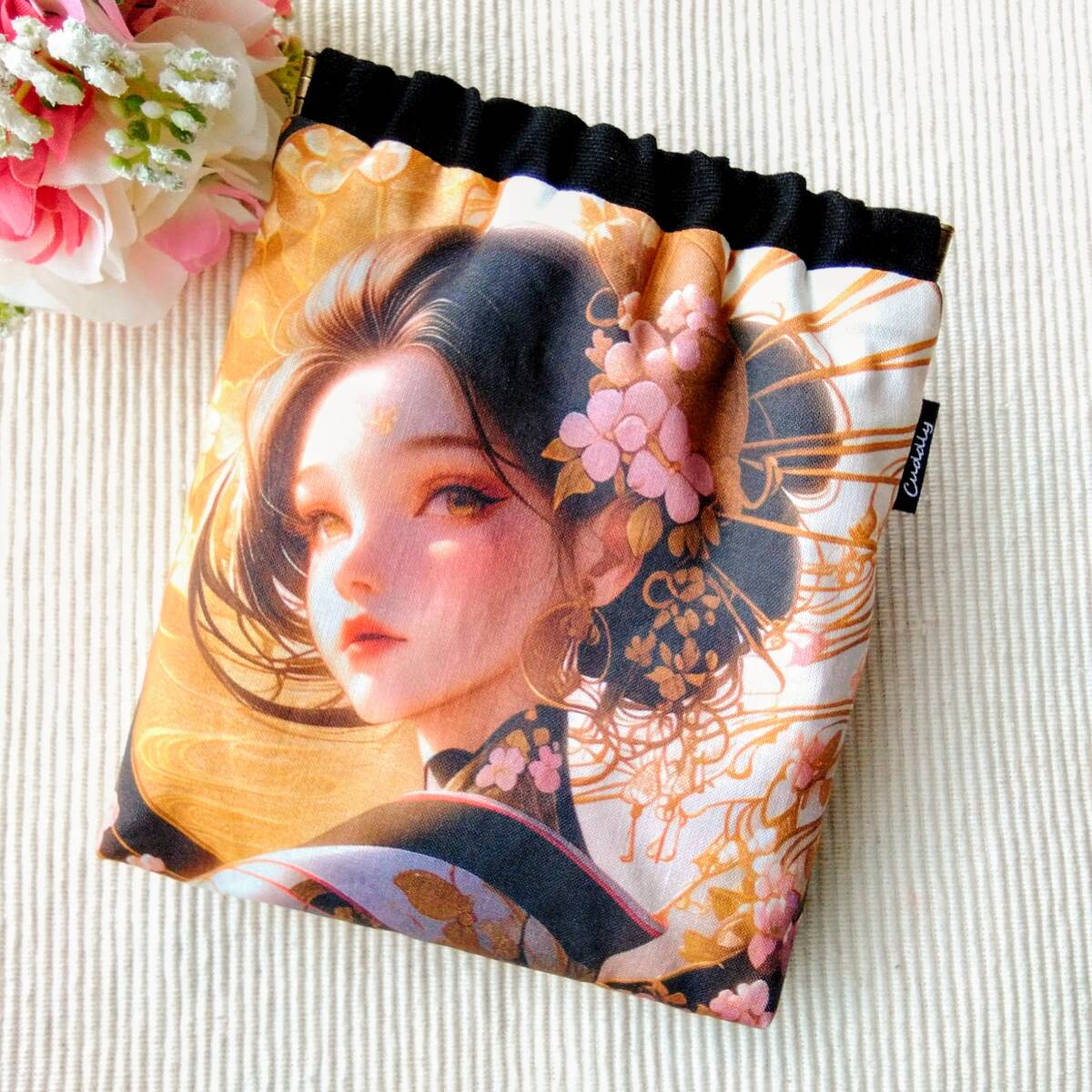 - ハンドメイド バネポーチ 百花繚乱 ブラック パネル生地