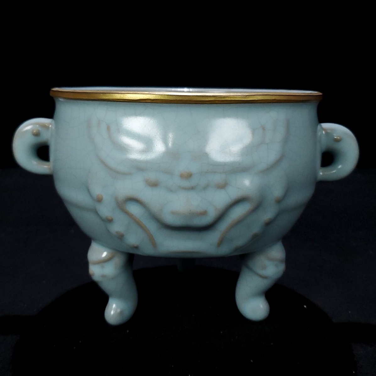 - 宋時代 磁器 秘蔵 汝窯 天藍釉「寿成殿、皇后閣」獣面紋包金三足炉・鼎 古陶磁器 陶芸 唐物 古賞物 時代物 骨董品 古置物 中国磁器 古玩923