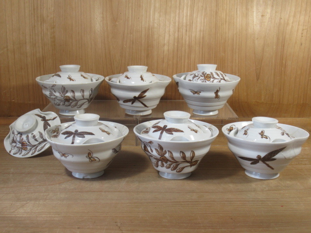 - ◆時代蓋茶碗6客◆『唐草トンボ蝶模様』◆鉄絵◆2度焼き瀬戸継ぎ修理修復◆茶道具◆元箱木箱付◆