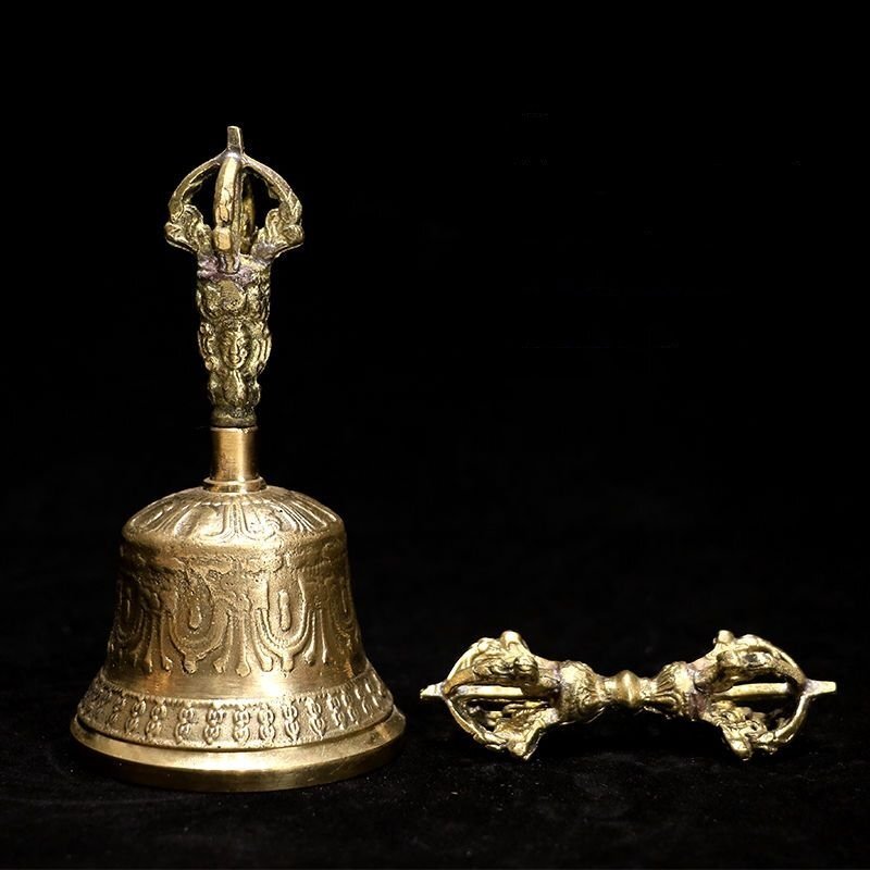 > 2点セット 唐密 東密 チベット 金剛杵 五鈷鈴 金剛鈴 持鈴 密教法具 チベット仏教 黄銅製 寺院仏具 法器 法具 魔除け 厄除け 小 ZH1729