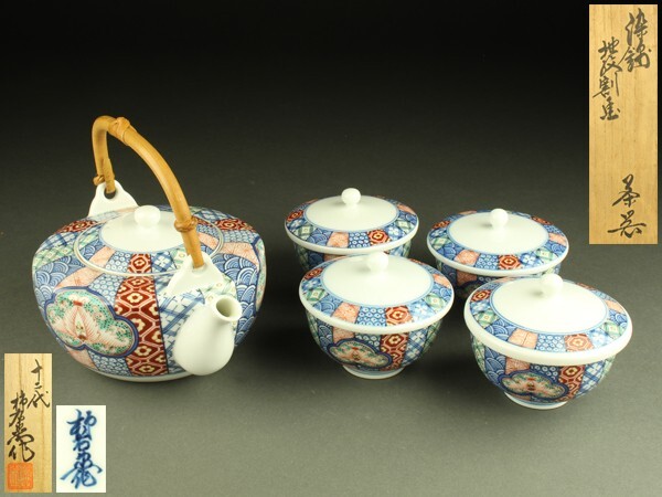 - 【宇】2312 十二代 酒井田柿右衛門作 染錦地紋割画 茶器揃 急須 煎茶碗 共箱 煎茶道具