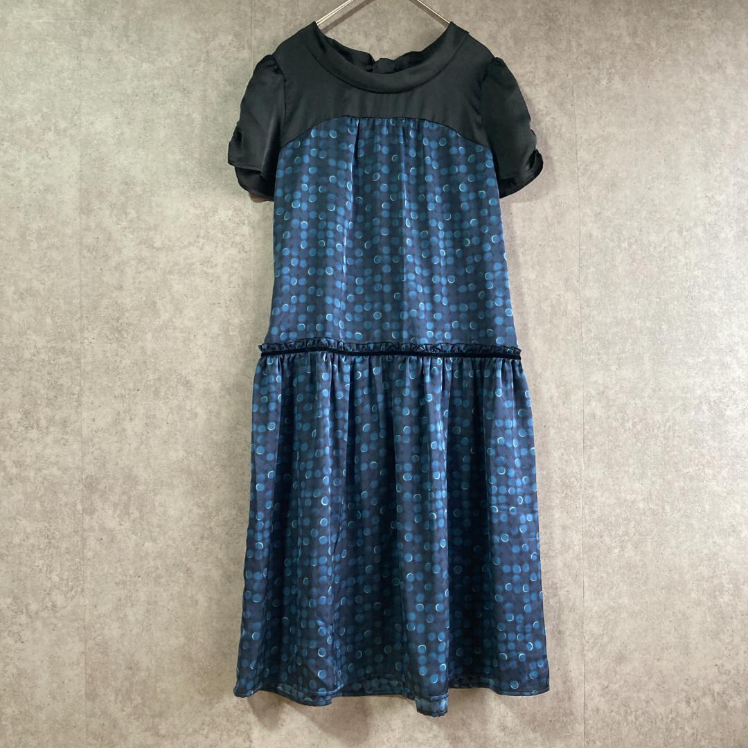 - 組曲(2)半袖ひざ丈ワンピース*ドット柄*後ろボウタイ*光沢感*ウエスト切替*青