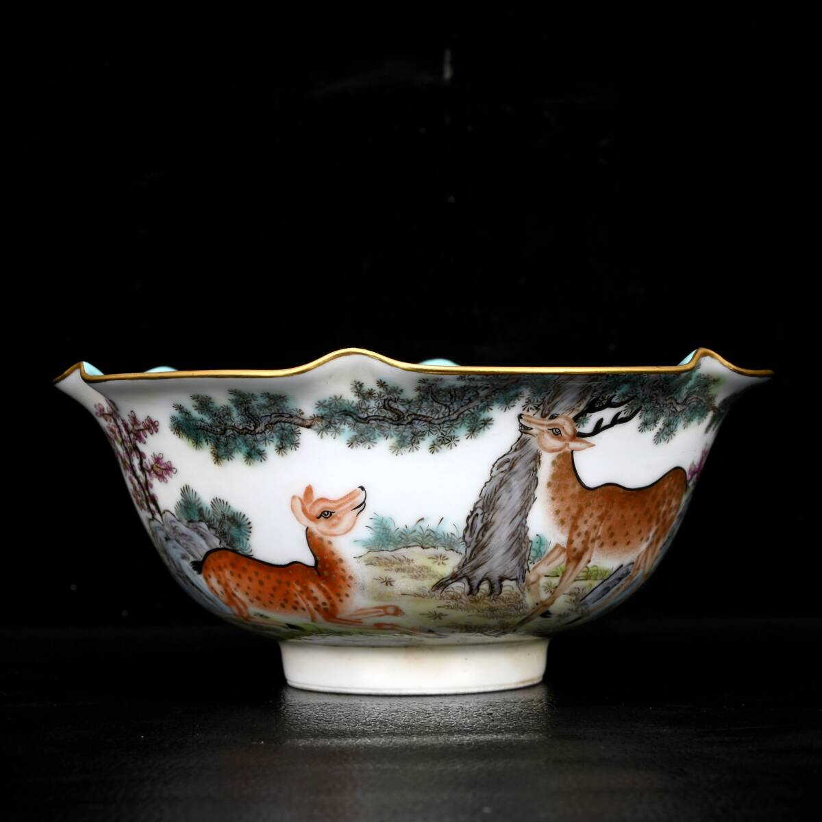 - 9+GV9627「東洋美術」 中国骨董 人間国宝 磁器製品【清朝乾隆時代の鹿文様のホーロー鉢】 旧物 孤品 珍品 陶磁器 収蔵価値が高い