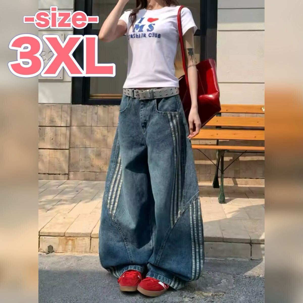 - ワイドパンツ デニム ジーンズ ストライプ ブルー ゆるダボ Y2K オルチャンファッション ストリート ダンス