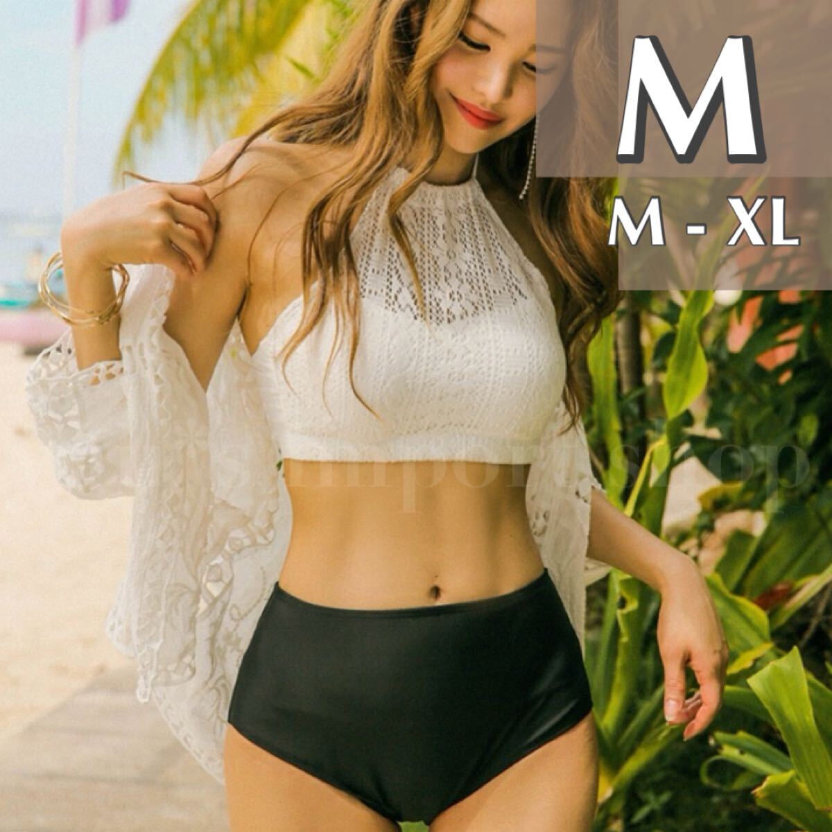 - 水着 レディース M ビキニ ホルターネック ハイネック 白 黒 バイカラー 露出少なめ レース アメスリ ハイウエスト パンツ