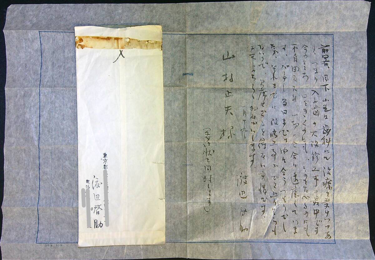 - 渡辺啓助 書簡封筒付 1通ペン1枚 39年1/19消印 SFミステリー推理