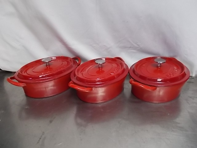 - ボン・ボネール ココットオーバル 26cm レッド 鍋3個セット 赤色 335×230×130 中古厨房 /A-9