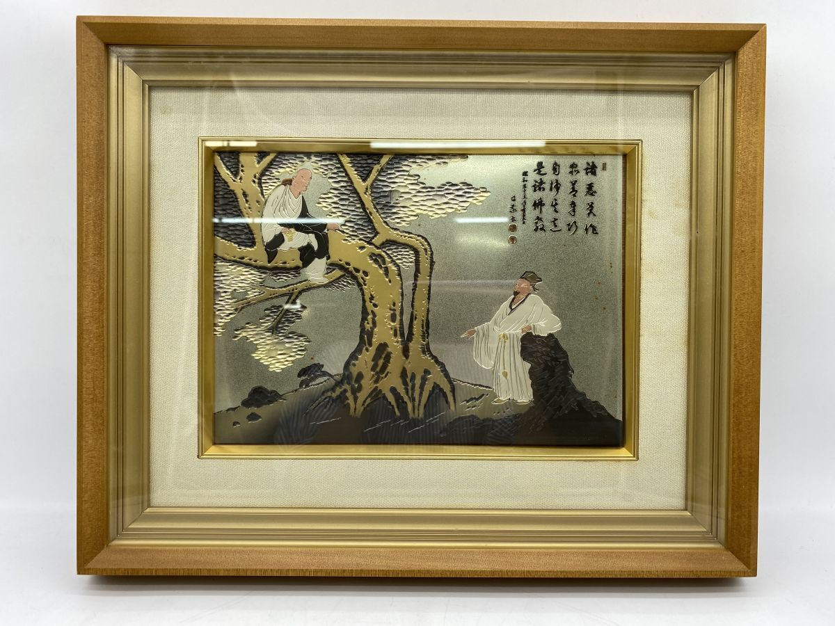 - 是法師益 山水図 在銘 漢詩彫刻 人物図 中国美術 額装 金属板 唐物 レリーフ 絵画(13385)