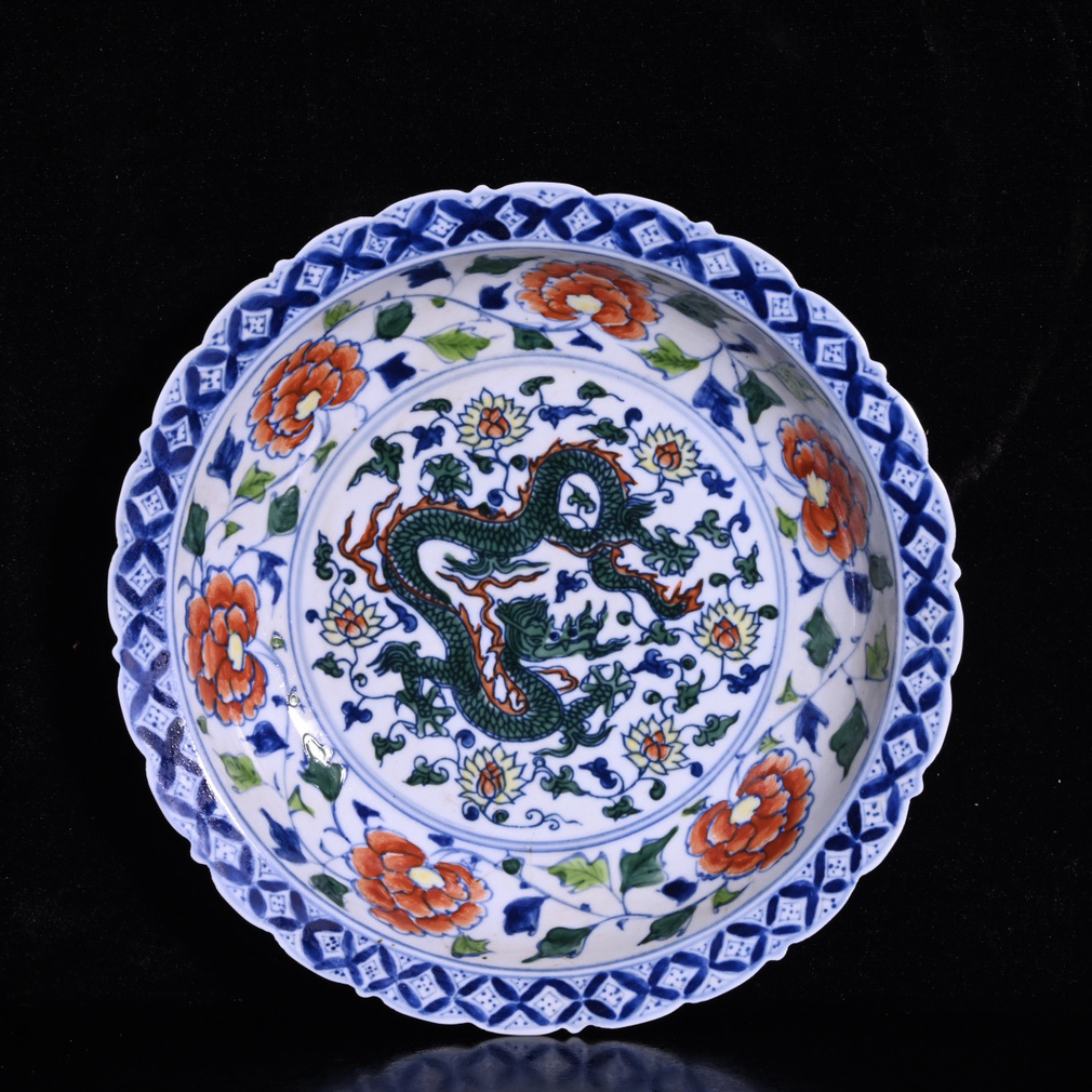 - 9+GV9715「東洋美術」 中国骨董 人間国宝 磁器製品【色鮮やかな龍模様のひまわり型皿】 旧物 孤品 珍品 陶磁器 収蔵価値が高い