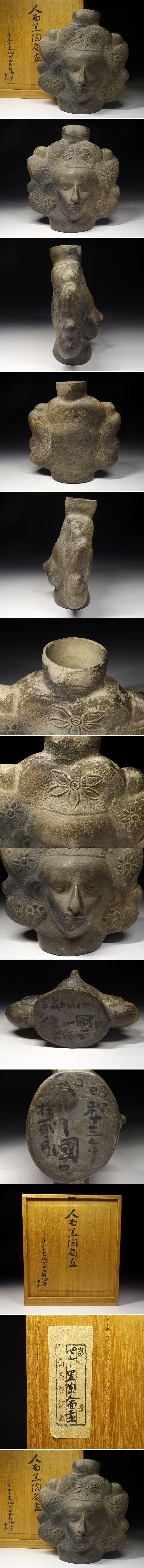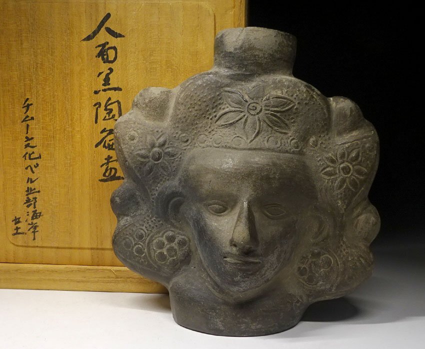 > 緑屋c■ 時代物 ペルー 土器 チムー文化 人面 黒陶 扁壷 木箱 アンデス インカ 土器 i9/7-7338/5-3#80