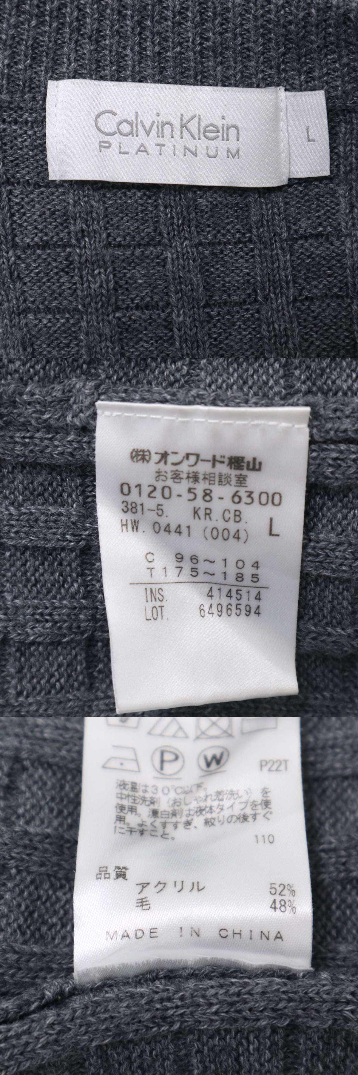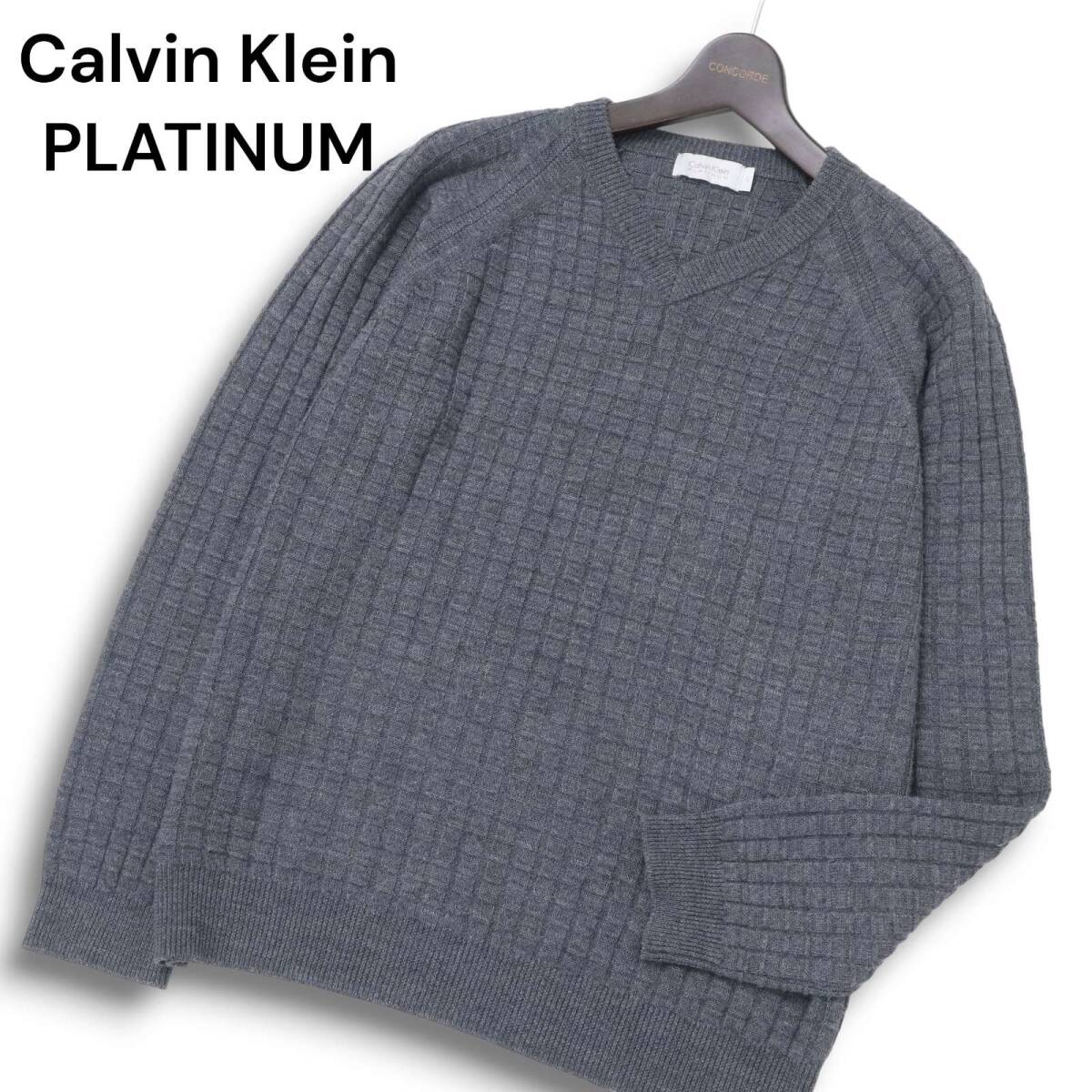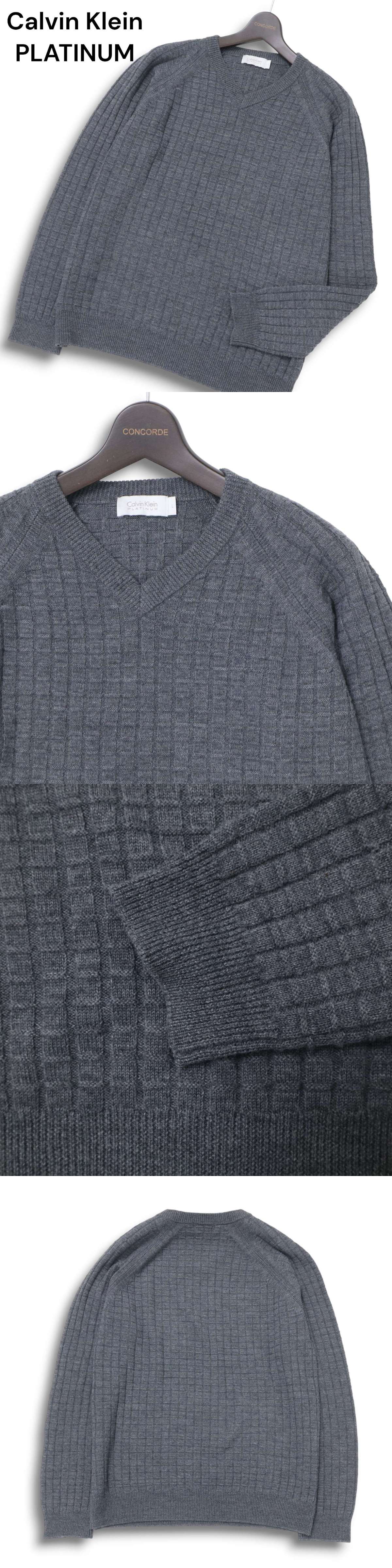 > Calvin Klein PLATINUM カルバンクライン プラチナム 秋冬 ウール混★ 格子状 Vネック ニット セーター Sz.L メンズ グレー