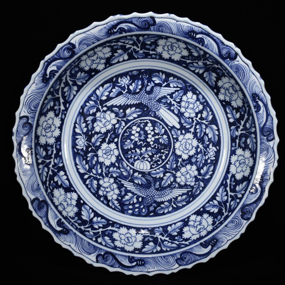 - ◆珍蔵◆中国古美術 元時代 元青花 古陶磁 牡丹花卉花鳥紋大盤 精品 細密細工造 置物 擺件 骨董品 古賞物 時代物