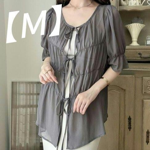 > シャツ ブラウス【M】 2way シャーリング シアー チャコール レディース レイヤードコーデ 3段リボン キャンディスリーブ 半袖