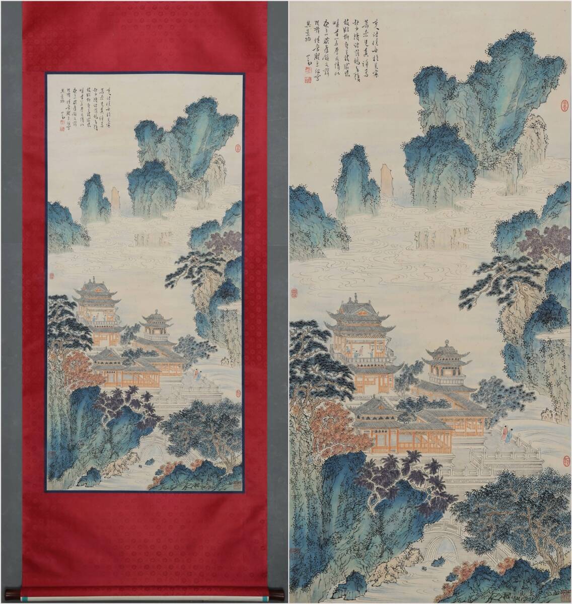 - 古美術 掛け軸 中国・近現代 「溥儒書」 紙本 【仙山楼閣図】 立軸 書道 巻き物 肉筆保証 唐物 古画 画心138x66cm LT-2509127
