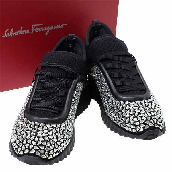 > 送料無料 本物 未使用 SalvatoreFerragamo フェラガモ スニーカー レディース 030237 750088 5 1/2 ブラック クリスタル ガンチーニ 女性