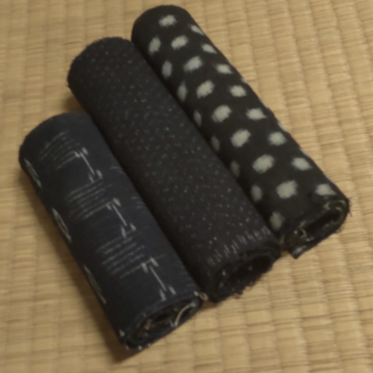 - 【時代布】古布 木綿 雪ん子 絣 かすり 半巾 3枚 合計約380cm 生地 古裂 アンティーク リメイク素材 A-2417